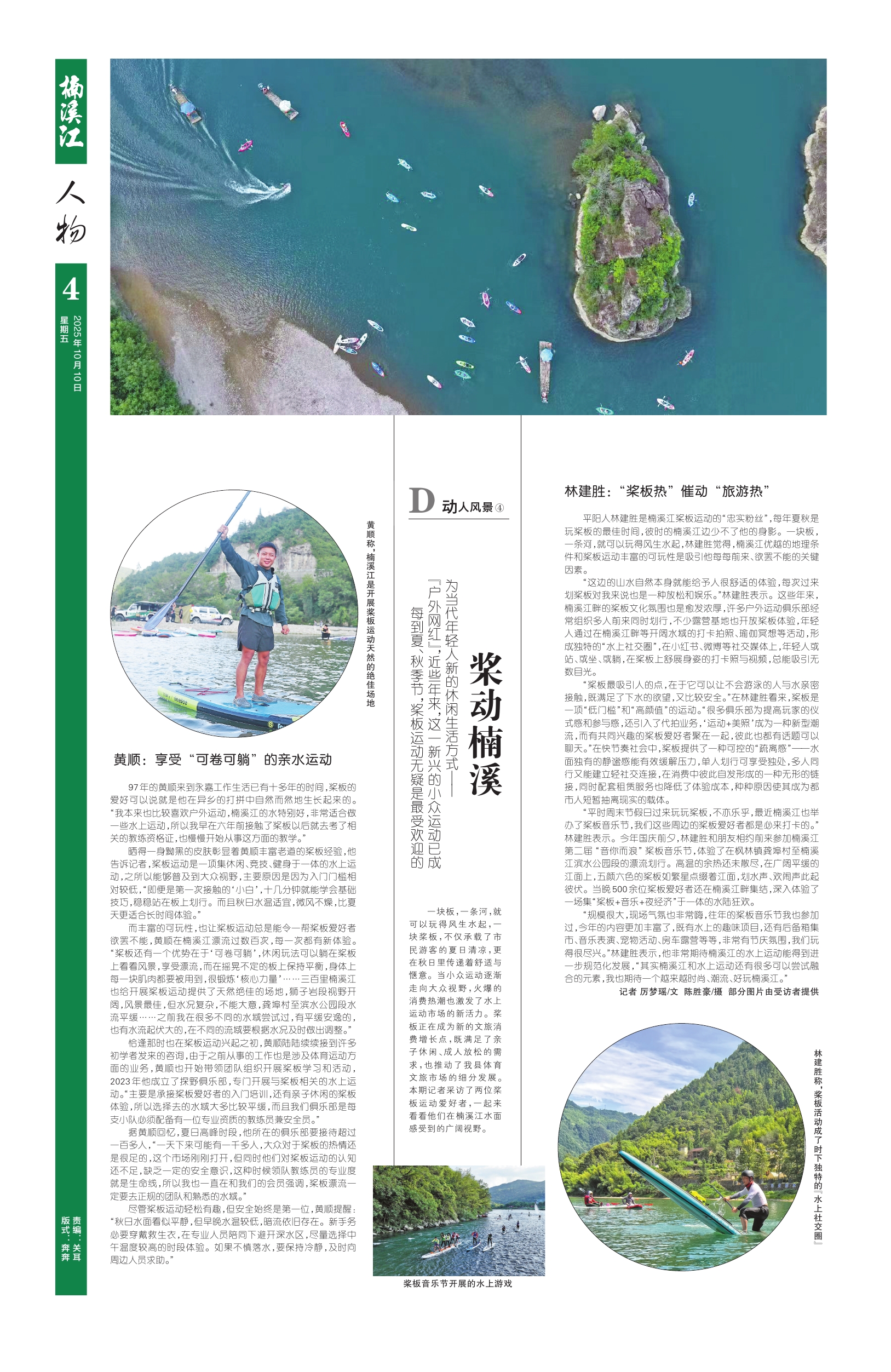 “平时周末节假日过来玩玩桨板,不亦乐乎,最近楠溪江也举办了桨板音乐节,我们这些周边的桨板爱好者都是必来打卡的。”林建胜表示。今年国庆前夕,林建胜和朋友相约前来参加楠溪江第二届 “音你而浪” 桨板音乐节,体验了在枫林镇龚埠村至楠溪江滨水公园段的漂流划行。高温的余热还未散尽,在广阔平缓的江面上,五颜六色的桨板如繁星点缀着江面,划水声、欢闹声此起彼伏。当晚500余位桨板爱好者还在楠溪江畔集结,深入体验了一场集“桨板+音乐+夜经济”于一体的水陆狂欢。