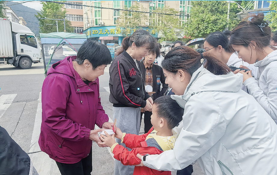 本报讯 重阳节当天,桥头镇坦头村村口茶香四溢,暖意融融。桥头镇中心幼儿园在此举办以“童心暖重阳”为主题的社会实践活动,小朋友们用自制的爱心茶饮和茶包,为社区老人送上节日祝福,以实际行动传承敬老爱老的传统美德。