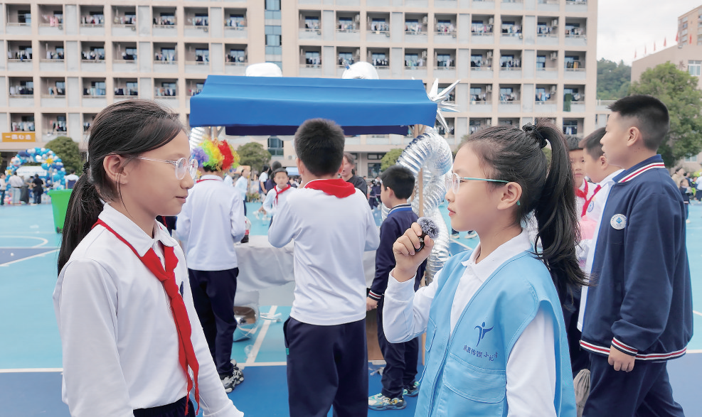 科技表演的余热还未散去,更加广阔的科学乐园已向同学们敞开怀抱。操场上,共设有24个科学探索驿站,从神奇的物理现象到有趣的化学变化,每个驿站都有各自的科学主题。同学们手持游园卡,穿梭在各个驿站之间,动手实践、完成任务、收集印章。“太神奇啦!”曾高兴同学刚体验完“空气炮”,兴奋地跑来当小老师:“你用手一拍箱底,里面的空气被猛地一挤,就会从圆洞里冲出来一个‘空气圈’,能把远处的纸杯塔打倒!”